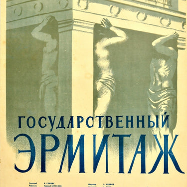 Original vintage Soviet film poster about the State Hermitage / Государственныи Эрмитаж featuring the five metre high Atlas statues at the historical portico entrance of the New Hermitage building in St Petersburg Russia. Founded in 1764 by the Empress of Russia Catherine the Great (Catherine II; 1729-1796), the State Hermitage Museum of art and culture is located between the Neva River embankment and Palace Square and is the second largest art museum in the world. Good condition, minor foxing at bottom.