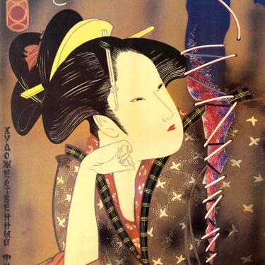 Original vintage Soviet movie poster Шаг - Step, a joint Soviet Japanese feature film set in Moscow and Tokyo in 1959 during an outbreak of polio in Japan, for which a Soviet scientist (Professor Gusev) has a vaccine to save the lives of children; a Japanese mother travels to the USSR and despite of the bureaucracy of both countries, she manages to make the vaccine available in Japan, saving the lives of 10 million Japanese children. Great image of a Japanese lady wearing a traditional kimono dress with the text above and in calligraphy style down the left margin. Very good condition, folds, faint creases.