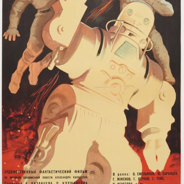 [ON RESERVE] Original vintage Soviet movie poster for the science fiction film Storm Planet (Планета бурь / Planeta Bura / aka Cosmonauts on Venus) directed by Pavel Klushantsev and starring Vladimir Yemelyanov, Georgi Zhzhyonov and Gennadi Vernov. Dynamic illustration of a robot holding up a cosmonaut in one hand as another cosmonaut tries to rescue him, against black and red flame background with the stylised title and credit text below. [This sci-fi film was remade as Voyage to the Prehistoric Planet and released in USA in 1965, then as Voyage to the Planet of Prehistoric Women in 1968.] Very good condition, backed on linen.