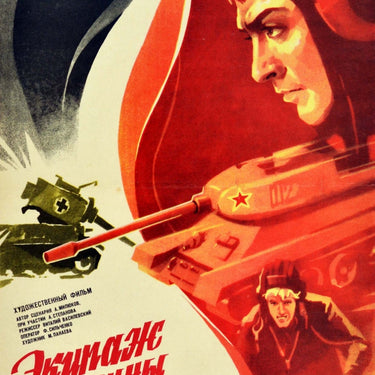 Original vintage film poster for a Soviet World War Two drama movie directed by Fyodor Silchenko - Battle Vehicle Crew / Экипаж машины боевой - set in 1943 and starring Leonid Yanovsky, Vladimir Vikhrov, Sergey Makovetsky and Mikhail Semyonov featuring a dynamic illustration in red depicting young soldiers and a Soviet tank on the right with red white and black smoke separating them from a damaged Nazi German tank on the left side, the title and credit text printed diagonally in bold stylised red lettering below. Produced by Odessa Film Studios / Odesskaya Kinostudiya. Very good condition, folded, restored tears.