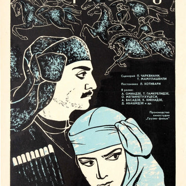 Original vintage Soviet film poster for the Russian release of a Georgian film Тариэл Голуа / Tariel Golua featuring a great image of a couple wearing traditional clothing in the foreground with men riding horses in the background, the text above and on the right in stylised letters. Very good condition, folded as issued, minor tears and faint creases in bottom margin.