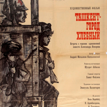 Original vintage Soviet movie poster for a black and white film Tashkent City of Bread scripted by Tarkovsky's collaborator Andrei Konchalovsky about a young boy who travels to the Uzbekistan capital to earn money for his hungry family (filmed during a period of relative political calm, the director Shukhrat Abbasov depicted the poverty and famine that resulted from the Bolshevik Revolution). Great artwork depicting a soldier sitting at the back of a last train carriage with with two young boys on the side and the title and text on the right. Fair condition, folds, small tears, small losses on fold lines, creases.