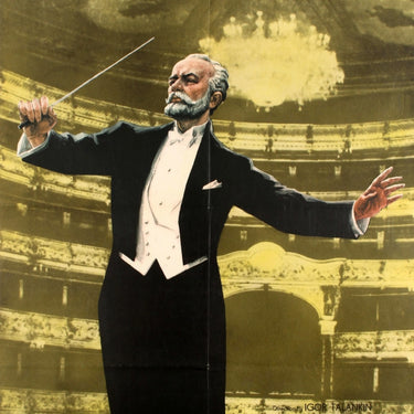 Original vintage Soviet movie poster for the two part Oscar nominated film Tchaikovsky about the renowned Russian composer Pyotr Ilyich Tschaikovsky (1840-1893), through his patron, the aristocratic influential art connoisseur Nadezhda Filaretovna von Meck (1831-1894), directed by Igor Talankin and starring Innokentiy Smoktunovskiy, Antonina Shuranova, Kirill Lavrov, Alla Demidova, Vladislav Strzhelchik and Yevgeny Yevstiigneyev. Great artwork featuring Tchaikovsky conducting an orchestra in front of a photograph of the Bolshoi Theatre in Moscow with the title in decorative black letters above. Large size. Good condition, folded as issued, minor defects in margins.