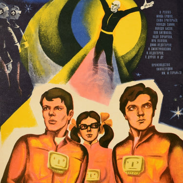Original vintage Soviet movie poster for science fiction film Teens in the Universe / Отроки во Вселенной directed by Richard Viktorov based on a script by Isai Kuznetsov and Avenir Zak featuring a bold illustration of three young Soviet pioneer (scouts) cosmonauts in space suits in front of a man in a black suit walking out of a space ship with his arms outstretched against a dark starry space background with robots on the side, the title text above and credits on the other side. Fair condition, restored tears, restored paper losses, restored folds, backed on linen.