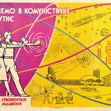Original vintage Soviet propaganda poster - Let's Look into the Communist future, Communism is created by the work of millions - featuring a dynamic and colourful design depicting illustrations of a man and lady holding out a ball of light and a white dove of peace against a purple background on one side and a rocket shooting in space in front of planets and stars with a class room of scientists at desks, computers and a satellite dish beaming up to the sky over a city with modern buildings, cars and boat on the water divided by atomic rings against a yellow background. Horizontal. Acceptable condition, tears, creasing, staining, restored paper losses on left margin.