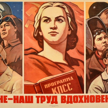 Original vintage Soviet propaganda poster - (Let's Give) Our inspired work to the Motherland! / Родине-наш труд вдохновенный! - featuring a dynamic design depicting three images of people in different industries with a lady in the centre holding an open book Программа КПСС / KPSS Programme in front of a hammer and sickle emblem on a red flag between a cosmonaut in a CCCP / USSR helmet, engineer and scientist wearing a clear visor mask in front of a rocket flying in the space background and a factory worker in a welder shield mask, farmer on a tractor and soldier in a military helmet with missile rockets and a field of wheat in the background, the bold text in red lettering along the bottom. Good condition, restored tears on edges, restored creasing, backed on linen.