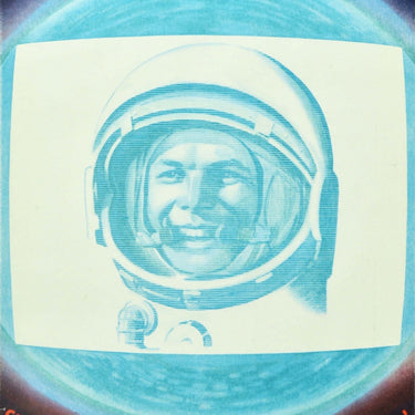 Original vintage Soviet space poster in celebration of Cosmonautics Day - Glory to Yuri Gagarin the first cosmonaut in the world! / Слава Юрию Гагарину первому космонавту мира! - featuring a smiling Yuri Gagarin (Yuri Alekseyevich Gagarin; 1934-1968), the Soviet pilot and cosmonaut who was the first man in space on 12 April 1961, in shades of blue and white on a TV screen image over the earth in blue with the bold red text curved above and below against the dark space background. 12 апреля 1961 День космонавтики / Cosmonautics Day is celebrated annually in the USSR Soviet Union and Russia since 1962 and internationally since 2011 as the International Day of Human Space Flight. Good condition, creasing, tears.