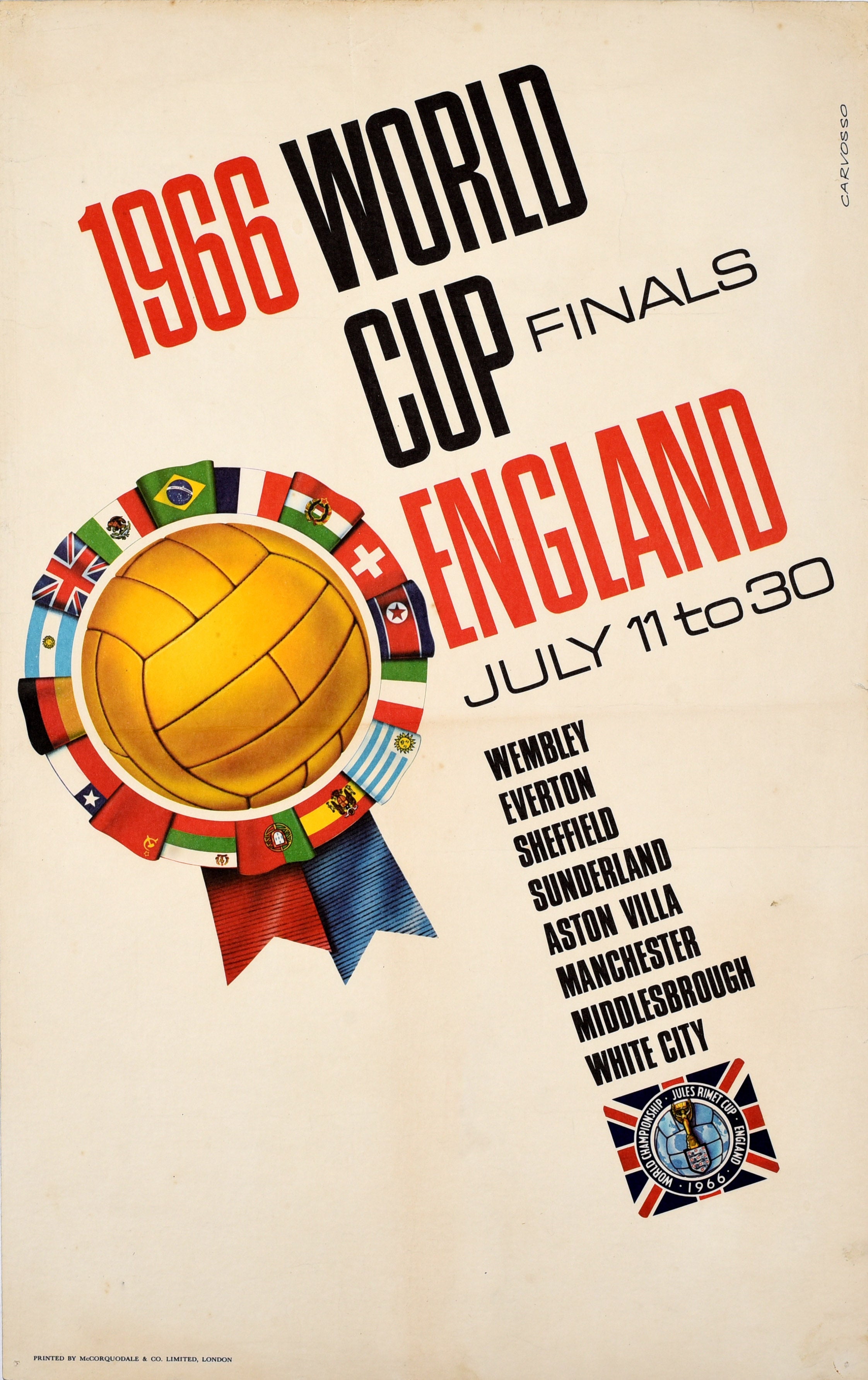 Original vintage sport advertising poster for the 1966 World Cup Finals held in England from 11 to 30 July at stadiums in Wembley Everton Sheffield Sunderland Aston Villa Manchester Middlesbrough and White City featuring a great illustration of a gold football surrounded by flags of the competing countries designed like a medal with ribbons below and the text in bold red and black letters diagonally on the side. The 1966 FIFA World Cup logo features the Jules Rimet Trophy in front of a Union Jack flag below. The 1966 World Cup Final was held at Wembley Stadium in London and was won by England in extra time, beating West Germany 4-2; the England team was captained by Bobby Moore (Robert Frederick Chelsea Moore; 1941-1993). Good condition, restored tears, restored pinholes, light folds, staining, backed on linen.