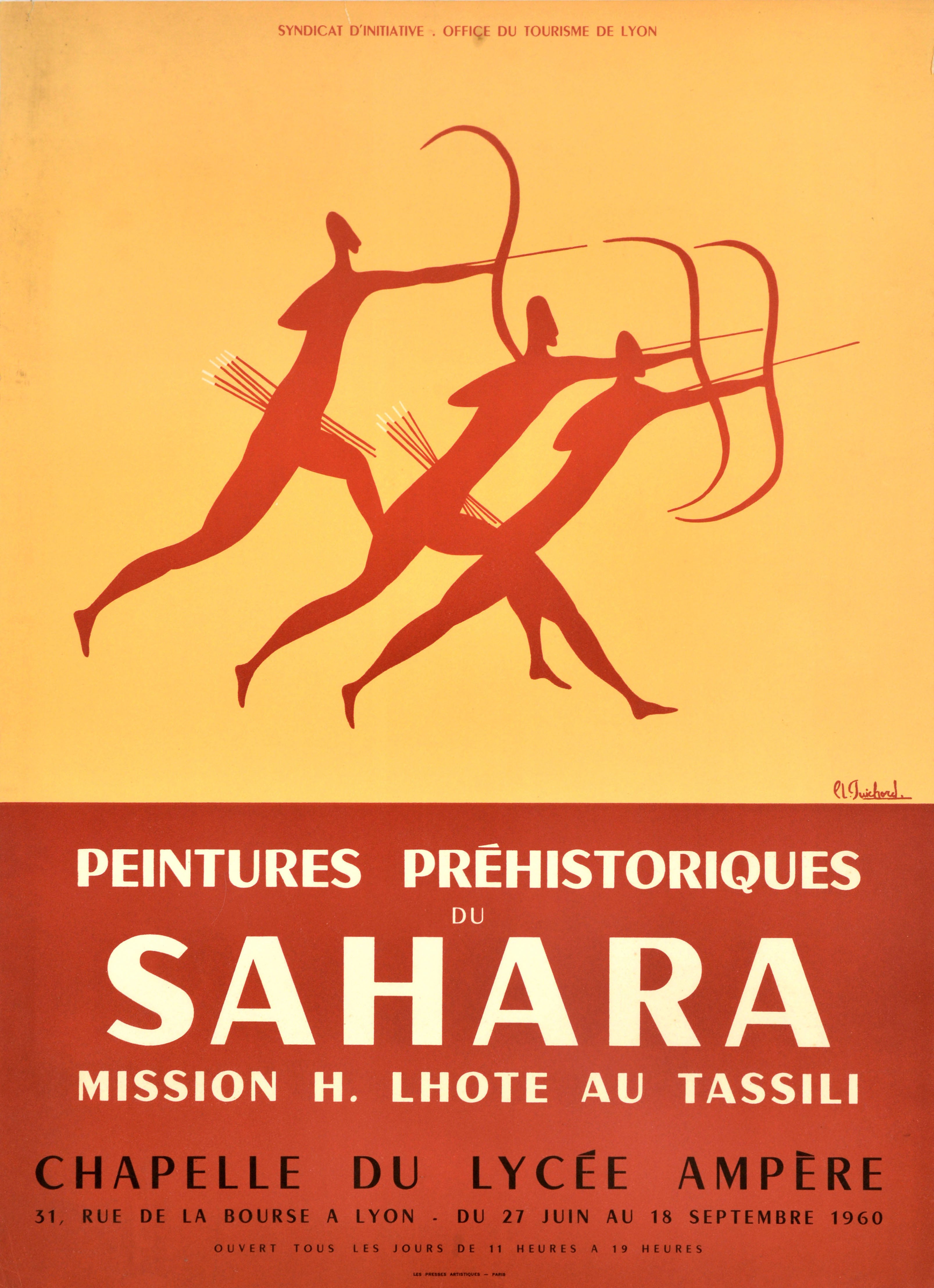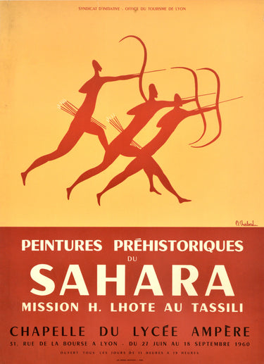 Original vintage advertising poster for an exhibition of Prehistoric Paintings of the Sahara Expedition H. Lhote Mission to Tassili / Peintures Prehistoriques du Sahara Mission H. Lhote au Tassili held at the Chapelle du Lycée Ampere chapel in Lyon from 27 June to 18 September 1960 featuring a primitive cave painting style image of three red silhouettes as archers armed with bows and arrows on a yellow background, the text below. The French explorer and ethnographer Henri Lhote (1903-1991) discovered prehistoric cave art in the remote Tassili-n-Ajjer plateau in Algeria on the edge of the Sahara desert in Africa with the help of information from the French soldier Charles Brennans and funding from the Musée de l’Homme in 1956; he documented around 800 artworks and returned on three more missions between 1958 and 1962. Published by Tourist Information Centre; Lyon Tourist Office. Printed by Les Presses Artistiques, Paris. Good condition, creasing, staining, tears.
