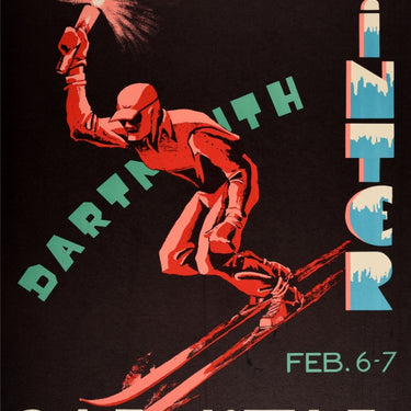 Original vintage ski poster for the Dartmouth Winter Carnival held on 6-7 February 1953 featuring a great graphic design by Dartmouth College student Leonard J. Clark (class of '56) depicting a skier holding up a lit torch and skiing downhill against a black background with the word Dartmouth curved behind him and the rest of the text in bold stylised snow topped lettering running down the side and below. The annual Dartmouth College Winter Carnival has been held since 1911. Good condition, restored paper losses, restored tears, restored pinholes, minor staining, backed on linen.