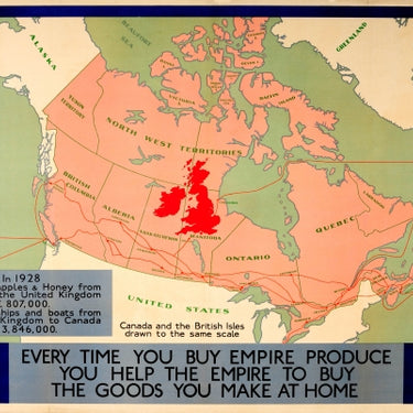 Original vintage advertising poster - Every Time You Buy Empire Produce You Help The Empire To Buy The Goods You Make At Home - issued by the Empire Marketing Board (EMB 1926-1933; formed to promote intra-Empire trade), code B.G.3. Colourful illustrative map by Charles Pears (1873-1958) featuring a map of Canada surrounded by Greenland, the United States and Alaska, the Atlantic Ocean, Pacific Ocean and the Beaufort Sea, with a map of the UK in the centre in red to show Canada and the British Isles drawn to the same scale with an information box below: In 1928 Exports of Apples & Honey from Canada to the United Kingdom £807,000. Exports of ships and boats from the United Kingdom to Canada £3,846,000. Horizontal. Good condition, restored folds and tears, restored minor loss on margins, backed on linen.