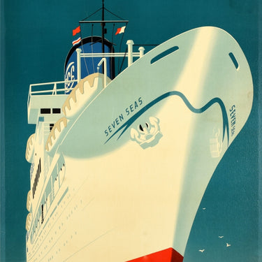 Original vintage travel advertising poster for Europa-Canada Line featuring artwork by Reyn Dirksen (1924-1999) depicting the Seven Seas ship with flags flying in front of its blue funnel, sailing at sea towards the viewer with seagulls visible in the distance and the title text above. The Europa Canada Line (1955-1967) was formed as a joint subsidiary of the Nederlandsch Amerikaansche Stoomvaart Maatschappij (NASM) Holland America Line (HAL) and the Koninklijke Rotterdamsche Lloyd (KRL), owned solely by HAL in 1963 and renamed the ECL Shipping Co in 1966. Built in 1941 the Seven Seas passenger cruise liner was owned by the Europa-Canada Linie from 1955 to 1966 for the company's Bremerhaven to Montreal and New York routes with stops from Europe to Canada in Rotterdam, Zeebrugge, Le Havre, Southampton, Quebec, Saint John, Halifax. Good condition, restored tears, restored paper losses, staining, backed on linen.