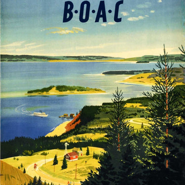 Original vintage travel poster - Fly to Canada by BOAC - featuring scenic artwork by Paul Chater (1879-1949) depicting a boat on calm blue water with an island and hills on the horizon, a sandy beach and cliff by the jetty with people walking and a person riding a horse along a path by a farm with trees framing the view in the foreground, the title text against the sky above and rest of the text below - British Overseas Airways Corporation in association with Qantas Empire Airways Ltd., South African Airways & Tasman Empire Airways Ltd. Good condition, restored tears and minor paper loss, backed on linen.
