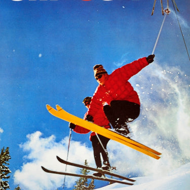 Original vintage skiing poster - Fly United Air Lines Ski USA - featuring a dynamic image of two skiers in red ski jackets, hats and glasses jumping on the snow below two people watching from a chair lift above with snow topped trees against the blue sky in the background and the stylised text above with a snowflake and USA in the red, white and blue American flag colours. Good condition, restored paper losses in margin, small restored creases in margin, backed on linen.