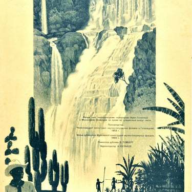 Original vintage documentary film poster for a Soviet release of a Czechoslovakian documentary film Z Argentiny do Mexika - From Argentina to Mexico / От Аргентины до Мексики featuring a great design depicting people with spears standing next to trees in front of a dramatic waterfall with cactus plants and a man in the foreground, the bold title lettering below with the credit text and description in the centre. Excellent condition.