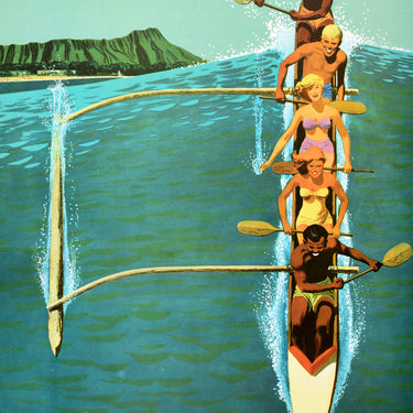 Original vintage United Air Lines travel advertising poster for Hawaii featuring a classic modernist design by the artist and illustrator Stan Galli (Stanley Walter Galli; 1912-2009) depicting a colourful and fun image of a group of smiling young people in an outrigger canoe surfing on a wave with people on a sandy beach and green mountain visible in the background, the text above and below in stylised white and yellow letters. Good condition, restored tears, restored paper skimming on corners, backed on linen.