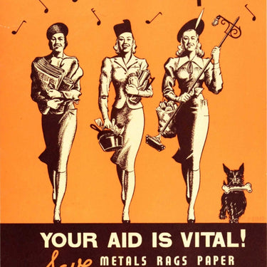 Original vintage Canadian World War Two poster - We're In The Army Now - featuring a great design showing three smiling ladies and a dog walking towards the viewer, the ladies carrying items for the recycling drive including pots and pans, newspapers and jars and the dog carrying a bone in its mouth, with the stylised title surrounded by music notes (referencing a 1917 song) above and the information below: Your aid is vital! Save metals rags paper bones rubber glass They are used in war supplies Get in touch with your local committee. Issued by Public Information for National Salvage Office Ottawa under authority of Hon. J.G. Gardiner Minister of National War Services. Good condition, pinholes, repaired tears, minor creasing.