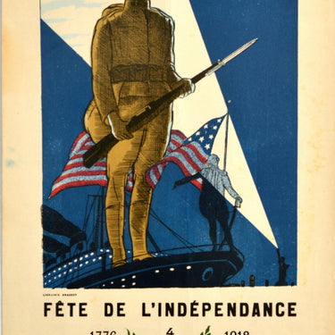 Original antique World War One propaganda poster for American Independence Day - Pour la Liberte Fete De L'Independance 1776 4 Juillet 1918 / For Liberty Independence Day 1776 4 July 1918 - featuring a short Independence Day history in America with a quote by the President of the United States Thomas Woodrow Wilson (1856-1924; in office 1913-1921) in French below a dramatic image of a US soldier in uniform holding a bayonet rifle gun and standing on the deck of a steamship with a light shining from the Statue of Liberty on the American stars and stripes flag and statue of the Founding Father and first President of the United States George Washington (1732-1799; in office 1789-1797) against the dark blue night sky with the skyscrapers of New York City visible on the horizon. Good condition, small paper loss at top right corner.