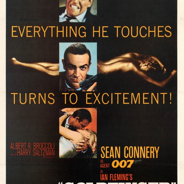 Original vintage 007 movie poster for the classic British spy thriller Goldfinger (the third film in the James Bond film series) directed by Guy Hamilton and starring Sean Connery with Honor Blackman as Bond Girl Pussy Galore, Gert Frobe as Auric Goldfinger, Shirley Eaton as the iconic Bond Girl Jill Masterson and Harold Sakata as Oddjob, the title music composed by John Barry and performed by Shirley Bassey. Great design featuring images of Sean Connery as James Bond in a fight scene, a love scene and looking out to the viewer holding his gun in front of the iconic image of Shirley Eaton as Bond Girl Jill Masterson covered in gold paint lying against a dark background with the slogans "James Bond is back in action! Everything he touches turns to excitement!" in white and yellow letters and the title and credit text below. Good condition, restored folds, creases and tears, restored small loss on margins, small pinholes on corners, backed on linen.