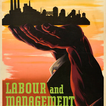 Original vintage World War Two poster - This is our Strength Labour and Management are pooling their strength to give us the means for victory in war ... and progress in peace - featuring a striking graphic design depicting the hands of a manual labourer with a rolled up sleeve on his arm and an office worker with a suit jacket and cufflink on his shirt, holding up a silhouette of an industrial factory with the smoke from the chimneys below the bold title text on the yellow and pink sky background, the rest of the text below. Printed in Canada. Issued by the National Film Board Ottawa. Good condition, restored folds, restored tears, restored creasing, minor staining, backed on linen.