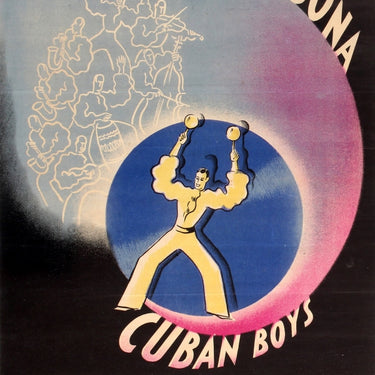 Original vintage advertising poster promoting the Lecuona Cuban Boys music released by the Columbia records label. Great design depicting a smiling musician playing the maracas in front of a blue record circle with the full orchestra in the background, the text stylised letters around the image with the list, Columbia brand and music note below in white and red letters. Founded by Ernesto Lecuano in the early 1930s, the Lecuona Cuban Boys orchestra was a popular instrumental band that toured the world until 1975. Good condition, creases, folds on top and bottom right corners.