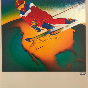 Original vintage sport poster published by the Levi Strauss clothing brand (founded 1853) for the 1980 Moscow Olympic Games featuring dynamic artwork depicting a skier in red, white and blue skiing at speed with the white spray of snow lit up over the map of North America highlighted on a globe above small silhouettes of a ski jumper leading to a skier with arms outstretched to wings, the Levi's logo and stylised title text in the margin below. One of a series of six posters commissioned by the blue jeans manufacturer Levi's as official sponsors of the US team for the 1980 Olympic Games; this Levi's Olympic Opportunity Sweepstakes campaign emphasised a sport associated with each of the six continents competing in the event - Skiing (North America), Gymnastics (Asia), Swimming (Australia), Track & Field (Africa), Soccer (South America), Cycling (Europe) - but the posters were withdrawn following the decision by US President Carter to boycott the Olympics in protest after the USSR invaded Afghanistan in December 1979. Excellent condition.