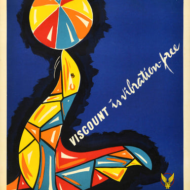 Original vintage travel advertising poster for Indian Airlines Corporation - Viscount is vibration free - featuring a fun illustration of a colourful seal balancing a striped beach ball on its nose with a plane flying across the dark blue background, the slogan diagonally on the side and rest of the bold text with the IAC winged logo below. Founded in 1953, the state owned Indian Airlines Corporation merged to become part of Air India in 2011; the company introduced the Vickers Viscount to its fleet in 1957; this successful and popular British turboprop airliner was manufactured from 1948-1963. Good condition, repaired tears, minor staining, minor creasing, backed on linen.