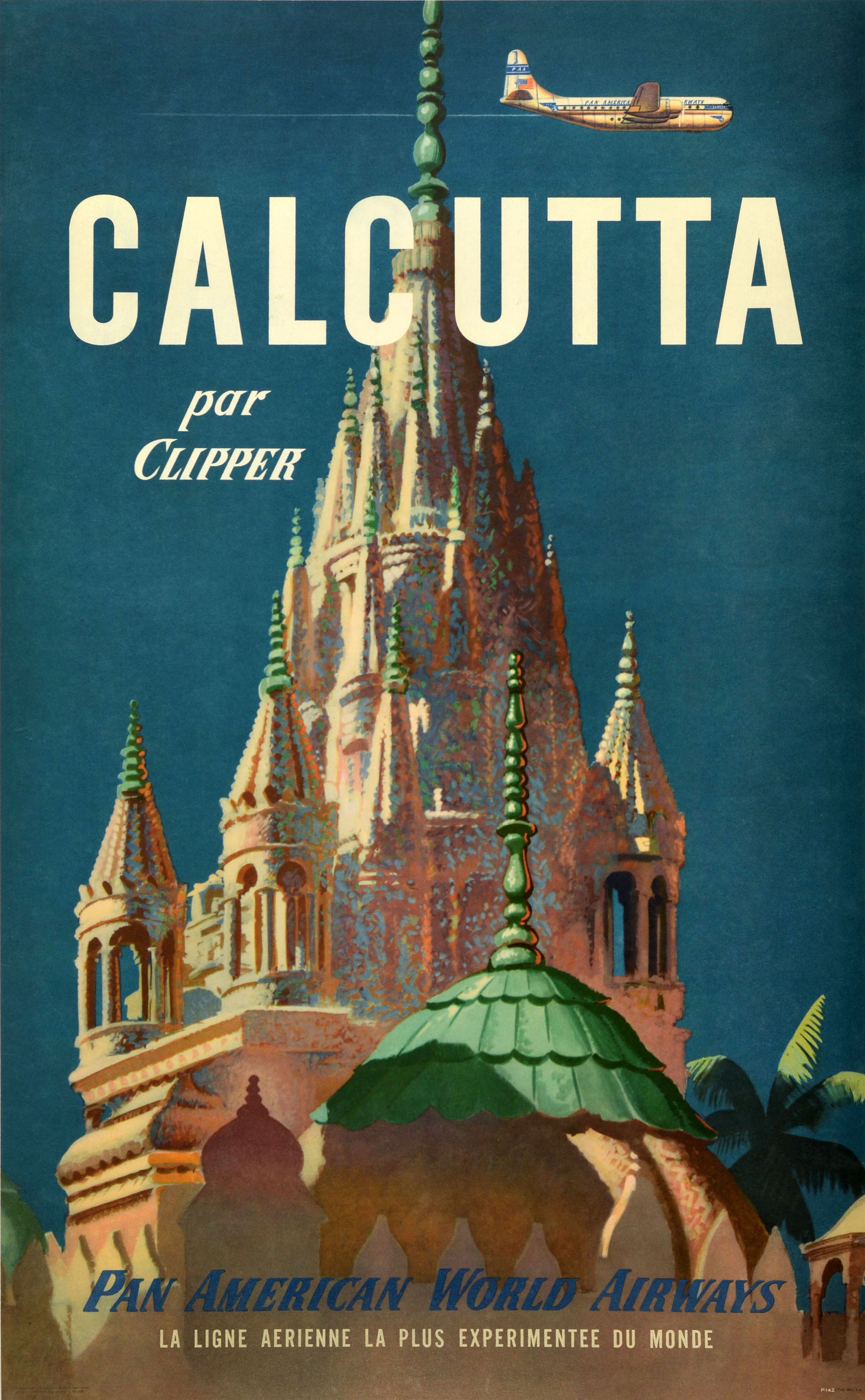 Original vintage Asia travel poster for Calcutta par Clipper Pan American World Airways La Ligne Aerienne La Plus Experimentee Du Monde / The World's Most Experienced Airline featuring great artwork depicting a colourful view of the historic Parshwanath Jain temple in Calcutta / Kolkata India with a plane flying overhead against the blue sky background, the bold text over and below the image, a palm tree on the side. Good condition, restored tears, minor creasing, minor staining, backed on linen.