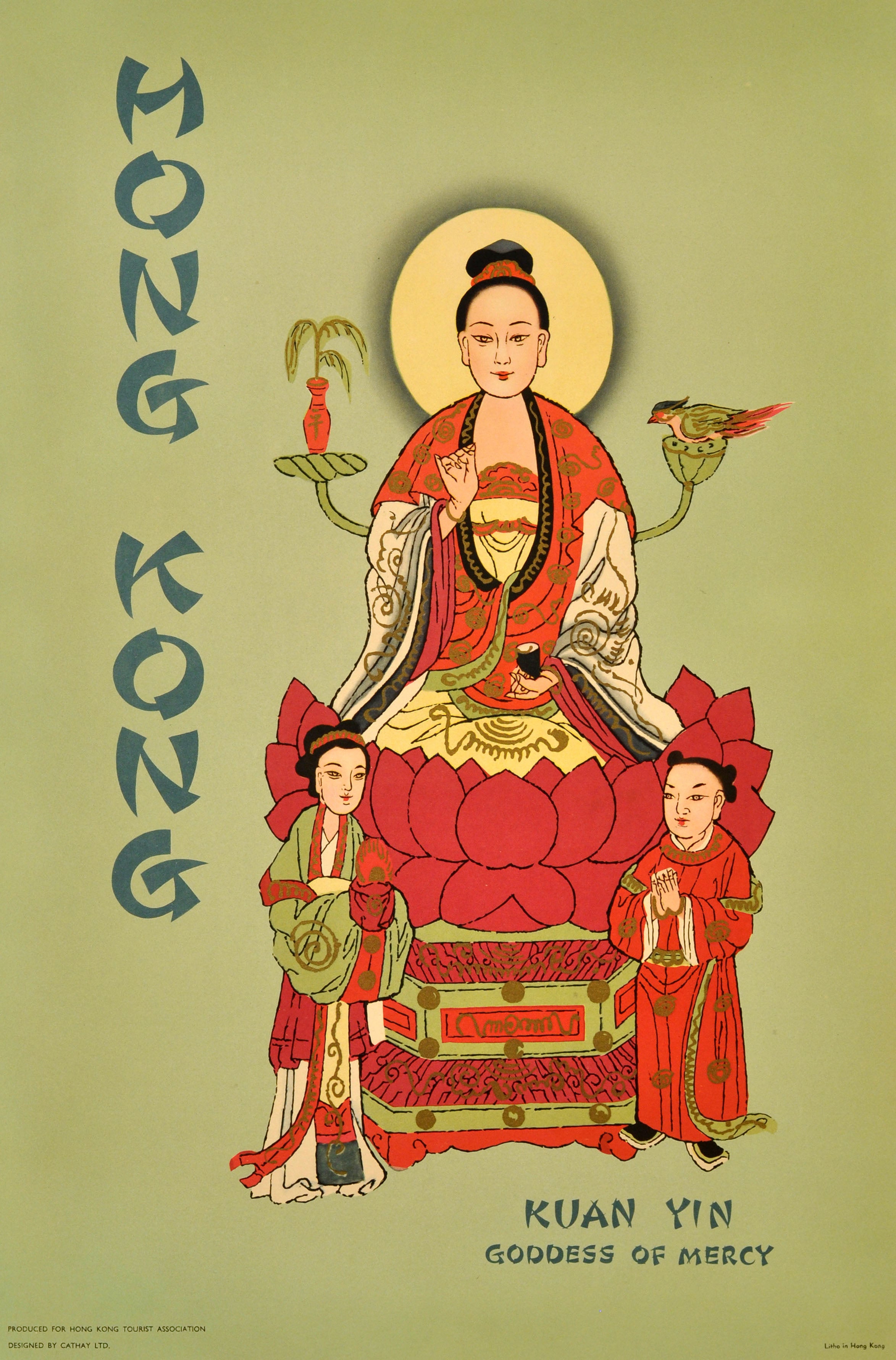 Original vintage travel advertising poster for Hong Kong featuring an image of Kuan Yin Goddess of Mercy on a green background sitting on a lotus flower (a symbol of purity and beauty) holding a jar of pure water with a willow branch (to help ward off evil spirits) and bird by her side and two children below, the girl Longnu (Dragon Daughter) and boy Sudhana (Child of Wealth), the text in stylised lettering down the side and below. Produced for the Hong Kong Tourist Association. Designed by Cathay Ltd. Litho in Hong Kong. Good condition, restored stains and minor loss, backed on linen.