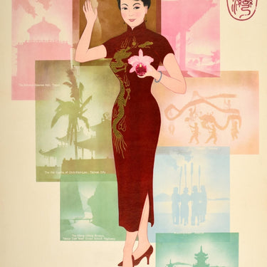Original vintage Asia travel poster for Taiwan Republic of China issued by the Taiwan Visitors Association featuring a colourful design depicting a lady wearing a traditional cheongsam dress in red decorated with a dragon up the side, holding a flower and smiling and waving to the viewer in welcome front of a collage of tourist destination and other images including The Suao-Hualien Highway, Grand Hotel Taipei, a Mountaineer Dance, Spring & Autumn Pavilions Tsoying, The Ching-Chung Bridge Taiwan East West Cross Island Highway, The Old Castle of Chi-kan-lou Tainan City, a Dragon Dance and The National Science Hall with the stylised title text below and stamp on the side above. Good condition, repaired tears, staining, backed on linen.