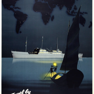 Original vintage travel advertising poster: Travel by The East Asiatic Company Ltd. Head Office Copenhagen. Fantastic artwork by Dalsgaard depicting a cruise liner ship on calm water with two people visible under a light on a junk boat sailing towards the ship in the foreground, a map of the world with luminous spots marking the destinations served by the East Asiatic Company in Europe, America, South America, Africa and Asia as stars in the night sky above and the text below in stylised white letters. Printed in Denmark by F. E. Bording. Excellent condition, minor creases and tears in left margin.
