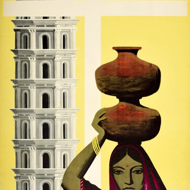 Original vintage travel poster - Visit Goa - featuring colourful artwork depicting a lady carrying pots on her head with the Lamp Tower of the historic Shri Mangesh temple in the background, set against a pale yellow background with a white cross in the centre and the title text in bold stylised black and red lettering above, the information below - For enquiries: Agencia Geral do Ultramar R. de S. Pedro de Alcantara Lisboa. Good condition, restored tears, staining, backed on linen.