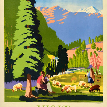 Original vintage travel poster - Visit Kashmir - featuring a scenic view of shepherds tending to their sheep on a green field, one sitting and playing music on a flute under the shade of a tree with a waterfall and river, a tree with pink blossom flowers, forests on the hills and snow topped mountains in the background. Issued by the Government of Jammu and Kashmir. Good condition, restored paper loss in top left corner, restored tears, minor creasing, minor staining, backed on linen.