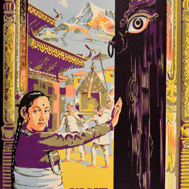 Original vintage Asia travel poster - Visit Kathmandu - featuring colourful artwork of a lady holding a door open for the viewer to reveal a procession walking in front of a Buddhist temple with snow topped mountains of the Himalayas in the background, an eye painted on the door representing Buddha's all seeing wisdom and the title text below. Published by His Majesty's Government of Nepal, Ministry of Public Works, Transport and Communications, Department of Tourism, Kathmandu Nepal. Printed by Glasgow Printing Co. Private Ltd Howrah. Good condition, restored paper losses, restored tears, staining, backed on linen.