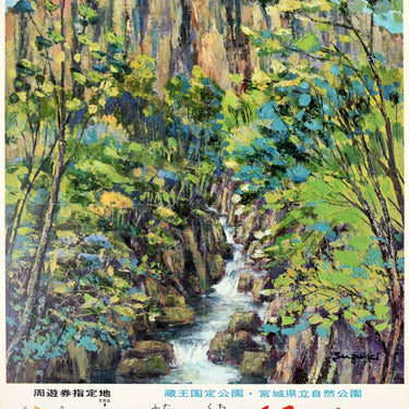 Original vintage Japan travel poster for the tourist destinations of the Zao Quasi National Park and Miyagi Prefectural Natural Park / 蔵王国定公園・宮城県立自然公園 くち 二口溪水 featuring scenic artwork depicting waterfalls flowing down a river with a mountain in the background and trees in the foreground, the bold red title lettering and route map below. Issued by the Akiu Tourism Association. Good condition, restored folds, restored tears, staining, backed on linen.