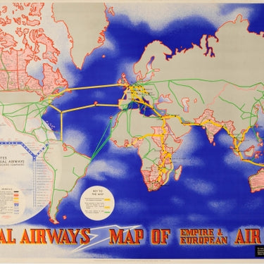 Original vintage advertising poster for Imperial Airways - Map of Empire and European Air Routes. Colourful and detailed image of a world map with some countries featuring towns and cities, showing The Routes of Imperial Airways and of Associated Companies, in a similar style to Harry Beck's (Henry Charles Beck; 1902-1974) recent 1931 London Underground tube map design. Artwork by the Hungarian artist and designer, Laszlo Moholy-Nagy (1895-1946). Printed by Curwen Press, London. Horizontal. Very good condition, restored tear on right margin, backed on linen.