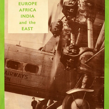 Original vintage travel advertising poster - Imperial Airways The British Air Line Travel in perfect comfort by the largest air liners in the World to Europe Africa India and the East - featuring a sepia-toned photograph of a man in uniform standing by the wheel of a propeller Heracles (Hercules) Handley Page HP 42 class passenger plane framed in a bold green border. Founded in 1924 the British airline Imperial Airways merged into the British Overseas Airways Corporation BOAC in 1939, later merging with the British European Airways BEA to form British Airways BA in 1974. Published by Imperial Airways Ltd from Airway Terminus, London. Printed in Great Britain by Henderson and Spalding Ltd, London. Good condition, restored tears, creasing, staining, backed on linen.
