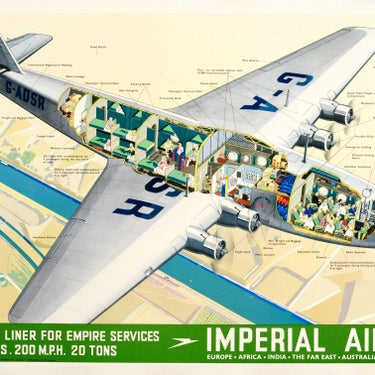 Original vintage travel poster for Imperial Airways: An Ensign Air Liner for Empire Services 2 decks 200 mph 20 tons featuring a great cut-out technical drawing of a Ensign Air Liner plane flying over what looks like the Suez Canal with a small town and a mosque below, the drawing showing the different sections and passengers inside the plane, including the cockpit and pilots, smoking cabin, midship and aft cabins with their sleeping berths, promenade deck, lavatories, kitchen and other facilities, the information text below on a green background with the speedbird logo - Imperial Airways - Europe Africa India The Far East Australia Bermuda New York - in bold white lettering. Artwork by the British artist and illustrator James Gardner (James "Leslie" Gardner; 1907-1995). Printed in Great Britain by Ben Johnson & Co. Ltd and published in England by Imperial Airways Ltd, London. Horizontal. Very good condition, restored losses and tears in the bottom margin, minor tears in the top margin, backed on linen.