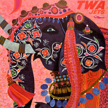 Original vintage travel poster for India Fly TWA Jets Up Up and Away featuring a colourful design by the American artist David Klein (1918-2005) depicting a decorative Indian elephant with smiling eyes in front of a pink shaded background, an image of a plane below the stylised lettering above with the slogan and TWA logo in the corner. Excellent condition, backed on linen.