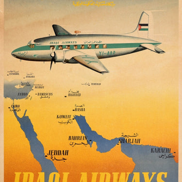 Original vintage travel poster for Iraqi Airways (founded in 1945) Iraqi State Railways (founded 1905; renamed Iraqi Republic Railways in 1956) featuring an Iraqi Airways Yi-ABP passenger plane with the 1924-1959 red, white and green flag with two white stars on a red trapezoid on its tail flying at speed over a map of the Middle East with cities from Pakistan and Saudi Arabia to Iran, Turkey and Egypt marked in English and Arabic - Karachi Sharjah Jeddah Bahrein (Bahrain) Koweit (Kuwait) Basra Cairo Lydda (Lod) Damascus Baghdad Teheran (Tehran) Beirut Nicosia Ankara Istanbul - the title text in bold Arabic and English lettering above and below. Printed in Great Britain by McCorquodale & Co Ltd London. Good condition, restored paper losses on edges, restored tears, staining, backed on linen.