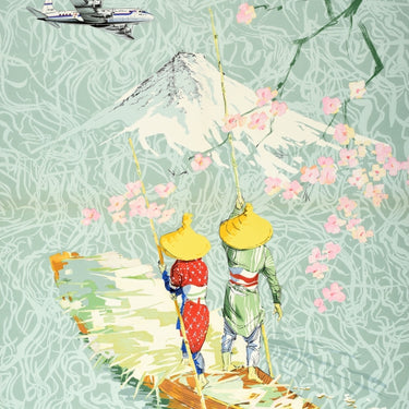 Original vintage travel poster for Japan issued by SAS Scandinavian Airlines System (founded 1946) featuring colourful artwork by Kurt Netzler (1922-2006) of two people wearing traditional clothing and hats rowing a boat on a swirly background with a cherry blossom flower branch hanging down on one side in front of a snow topped Mount Fuji and a plane flying overhead, the text in bold red lettering above and below in blue with the SAS logo Denmark Norway Sweden. Good condition, small restored tears, restored folds, backed on linen.