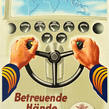 Original vintage KLM airline advertising poster - Caring hands / Betreuende Hande - featuring a great design showing the arms of a pilot in a blue and gold uniform holding the controls in the cabin of a plane with a world map featuring flight routes as the view through the cockpit window and the dashboard with in dials showing the names of KLM destinations to Europe, North America, South America, the Near and Far East, Africa, Tokyo and Sydney. KLM (Koninklijke Luchtvaart Maatschappij / Royal Dutch Airlines; since 1919) is the flag carrier of the Netherlands. Good condition, creasing, tears, folds, foxing.