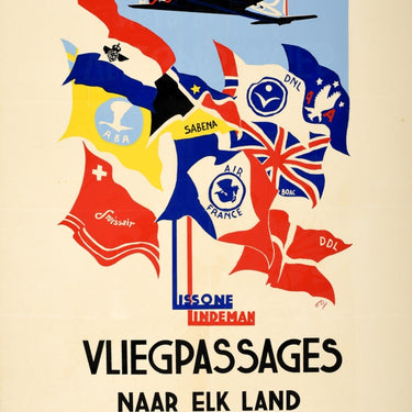 Original vintage travel advertising poster for Lissone Lindeman - Vliegpassages Naar Elk Land Voor Elke Luchtvaartmu / Air Passages To Any Country For Any Aviation - featuring a great illustration depicting a propeller passenger plane flying in the blue sky over the colourful flags of various airline logos - Swissair, American Airlines, ABA, Sabena, KLM, Air France, DDL, BOAC and DNL - leading down to the company name in bold blue and red lettering. In 1876 Jacob Lissone founded the first European travel agency in the Netherlands in 1876, partnering with Lindeman in the 1920s. Large size. Good condition, restored folds, restored paper losses, restored creasing, foxing, staining, backed on linen.