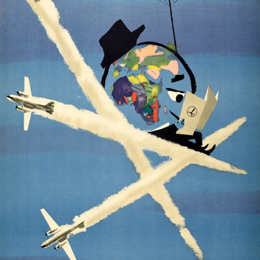 Original vintage travel advertising poster for Polish Airlines LOT (Polskie Linie Lotnicze; founded 1929) featuring a fun design showing three planes with their white trails forming a deck chair in the blue sky being used by a smiling globe of the world wearing a hat and suit and reading a LOT travel brochure whilst relaxing under a yellow and white striped sun shade, the bold text with the LOT crane bird logo in the letter O below. Artwork by the Polish illustrator and graphic designer Janusz Grabianski (1929-1976). Good condition, restored tears, restored pinholes, backed on linen.