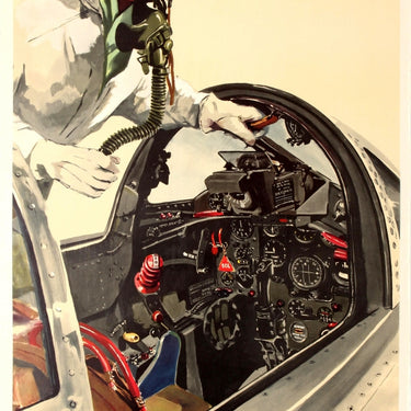 Original vintage military recruitment poster for L'Armee De L'Air / the French Air Force depicting a pilot in uniform with helmet and mask standing over the cockpit and control panel of his plane looking towards the viewer with the text below. L'Armee De L'Air was formed as part of the French Army in 1909 as the Service Aeronautique, becoming an independent military Air Force in 1934. Very good condition, creases in margin, small tears in margin.