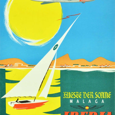 Original vintage Spanish airline travel poster issued by Iberia Lineas Aereas de Espana in German for the Costa Del Sol Malaga in Spain / Spanien featuring a colourful illustration of an Iberia Lockheed Constellation plane flying in front of bright yellow sun in the blue sky above a sailing boat on the Mediterranean Sea lit up by the reflection with the coastal town below the Montes de Malaga mountain range in the background, the text above and below in yellow white and red lettering with the winged yellow and red flag logo. Founded in 1927, Iberia is the national flag carrier of Spain. Rivadeneira S.A. Very good condition, creasing, minor staining.