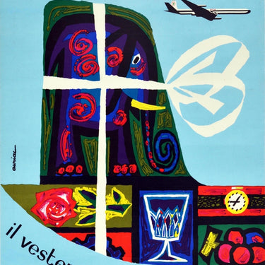 Original vintage advertising poster for Middle East airlines MEA featuring a colourful design by Jacques Auriac (1922-2003) showing the tail of a plane wrapped up with a white ribbon like a present and filled with objects including a rose flower, a wine glass, a watch and an elephant with is a second plane on the light blue background, the black text and the MEA cedar tree logo above and around the plane in the foreground: il vestero carico a km/ora 850 - your load at 850 km/hour. Founded in 1945 as Middle East Airlines (MEA), the national flag carrier of Lebanon based in Beirut was associated with BOAC until 1961; the airline merged with Air Liban and changed its name to Middle East Airlines - Air Liban SAL in 1963. Very good condition, creasing.