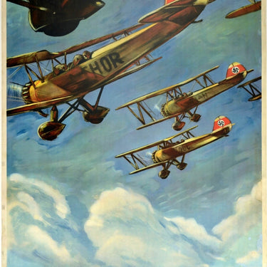 Original vintage propaganda poster for the Nationalsozialistische Fliegerkorps (1937-1945), the paramilitary organisation of the German Nazi Party - So fliegt das Nationalesozialische Fliegerkorps! / This is how the National Socialist Flying Corps flies! - featuring glider planes marked with the Swastika on the tails flying above clouds in the blue sky with the stylised bold text below. Large size. Fair condition, restored paper losses, restored tears, staining, backed on linen.
