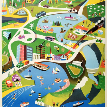 Original vintage travel poster for New Zealand featuring a colourful illustration design by the artist Dennis Arthur Leo Beytagh (1924-2016) depicting a map of the North Island showing various places including Wellington Harbour, Mount Ngauruhoe, the Central Plateau, Lake Taupo and Rotorua with people at work and on holiday taking part in various outdoor leisure and sport activities such as hiking, fishing, running on a track, hunting, playing golf and tennis, swimming, sunbathing, painting, horse riding, mountaineering, skiing on Mount Ruapehu, waterskiing, sailing, whale watching, kayaking and surfing with depictions of a Maori village, sheep farming, deer, birds, trees, a race course, rugby pitch, stadiums, ice rink, a waterfall, lighthouse, geysers and hot springs, a volcano, planes, trains, ocean liners and cars. Very good condition, creasing, backed on linen.