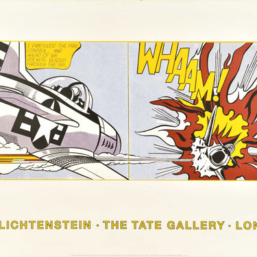 Original vintage art gallery exhibition poster featuring artwork by the notable American pop artist Roy Lichtenstein (1923-1997) depicting an iconic comic panel image of a military fighter jet shooting a rocket and hitting another plane exploding on the right, the caption reads - I pressed the fire control... and ahead of me rockets blazed through the sky... Whaam! - with the title text below - Roy Lichtenstein The Tate Gallery London. Printed by Westerham Press, Westerham, Kent. Horizontal. Very good condition, creasing, minor staining.
